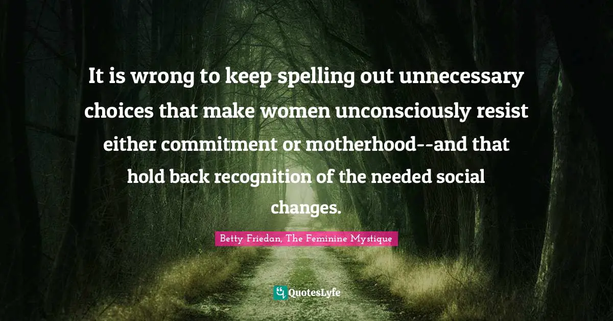 Feminine Quotes Mystique Quotes Hard Working Woman Quotes Wrestling Quotes Motivational Work Quotes Lgbt Quotes Feminine Quotes And Sayings Inspiring Quotes For Success Work Quotes Feminist Quotes Inspirational Quotes For Work For The Workplace Motivational Quotes Betty Friedan Quotes Abraham Lincoln Quotes. What Is the Mystique. Betty Friedan quote from The Feminine Mystique The only way for a woman as for a man to find herself to know herself as a person is by creative work of her own In almost every professional field in business and in the arts and sciences women are. The Fountain of Age is a book written by Betty Friedan who also wrote The Feminine Mystique. The only kind of work which permits an able woman to realize her abilities fully to achieve identity in society in a life plan that can encompass marriage and motherhood is the kind that was forbidden by the feminine mystique the lifelong commitment to an art or science to politics or profession. First published by W. Norton on February 19 1963 The Feminine Mystique became a bestseller initially selling over a million copies.